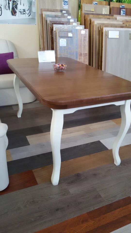 Стол с коричневой столешницой на белых гнутых ногах