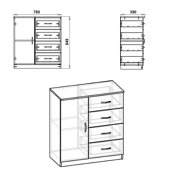 Размер упаковки: КОМОД-4+1 А — 838х432х170 мм.